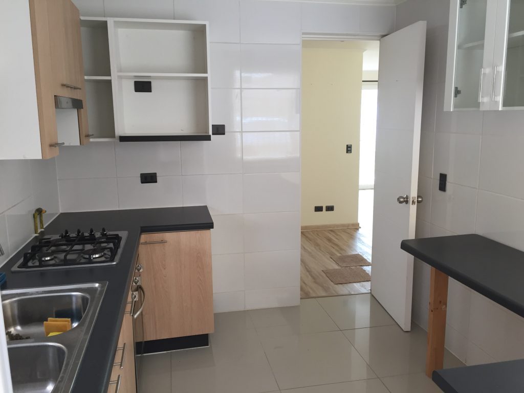 Cocina con piso porcelanato, amoblada y equipada con horno, encimera y campana