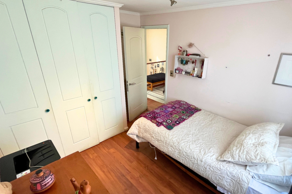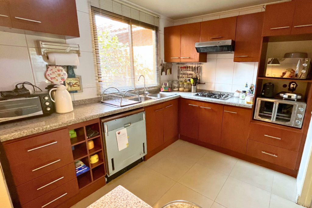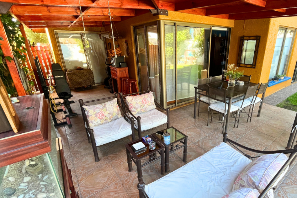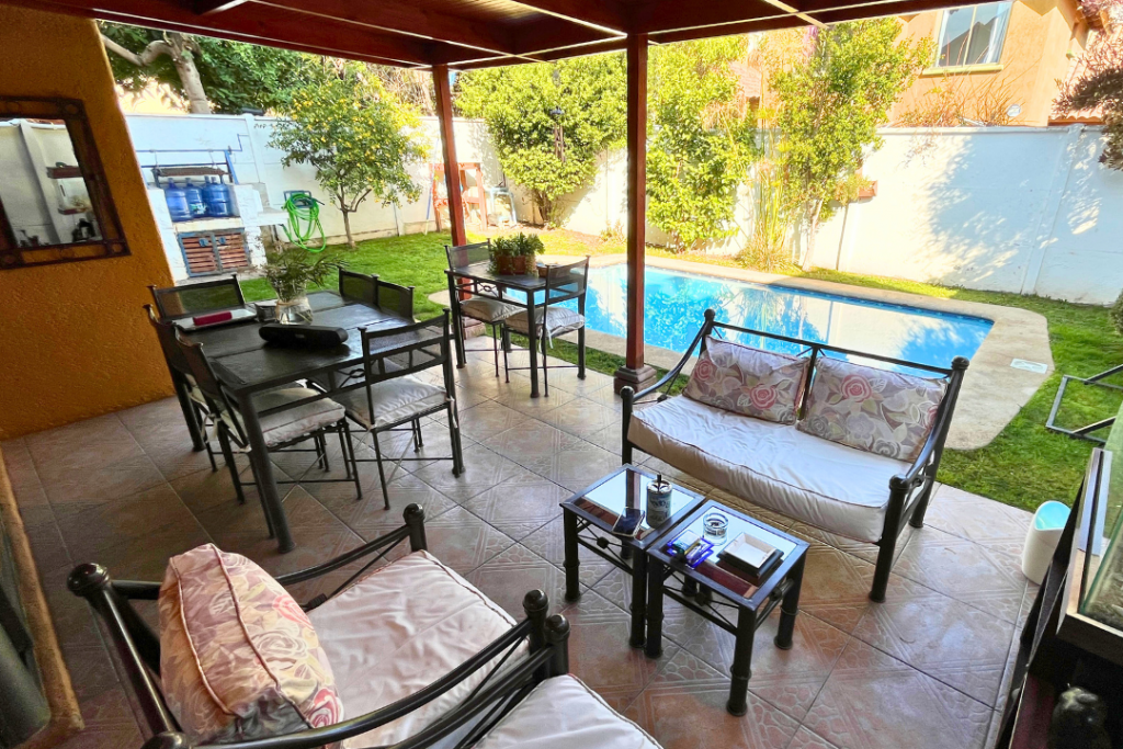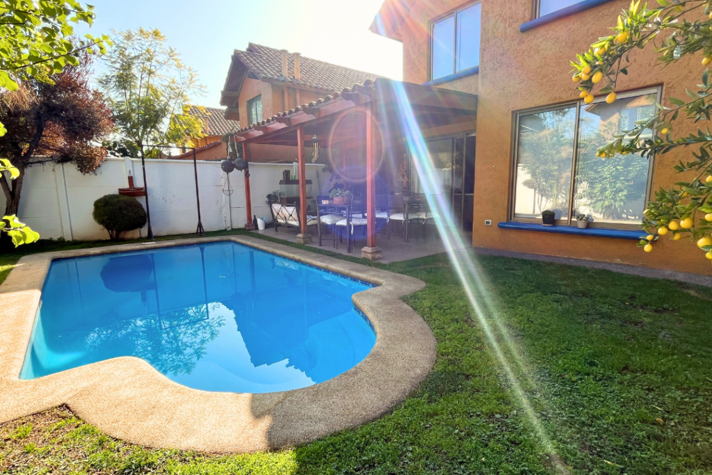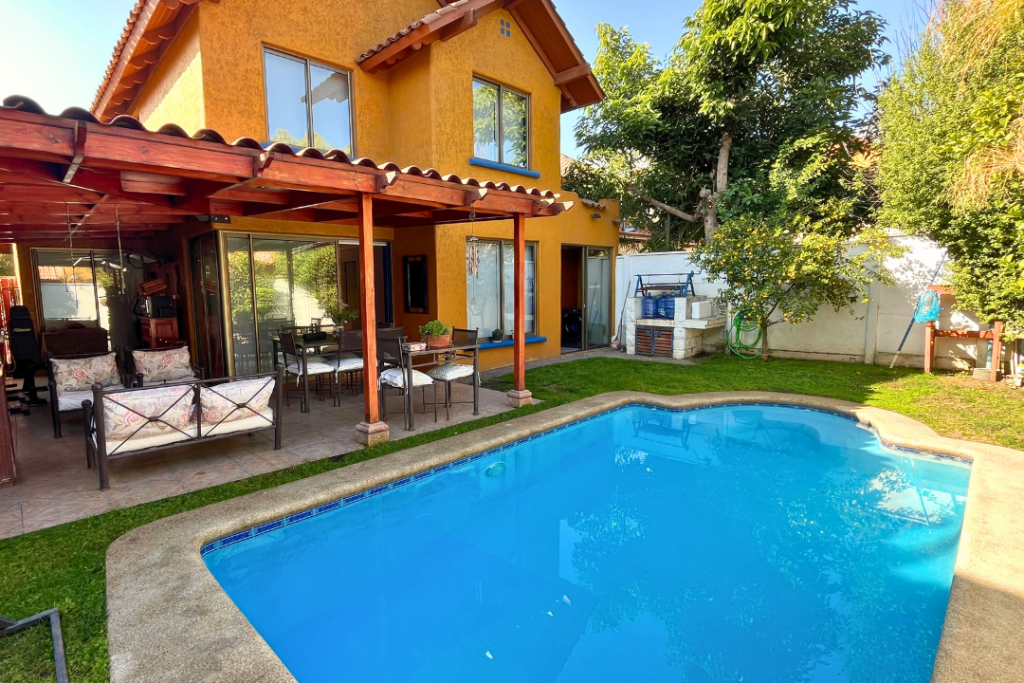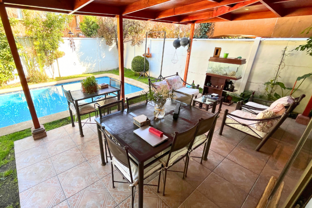 Portal Propiedades vende acogedora casa en sector residencial de Peñalolén, 4 dormitorios (principal en suite), 3 baños, 112 m² construido, 224 m² total de terreno, lindo patio con jardín formado y riego automático, quincho y terraza techada, piscina de hormigón 6X3, mejoras importantes: la casa cuenta con ventanas y ventanales termo panel, entretecho acondicionado como amplia bodega.